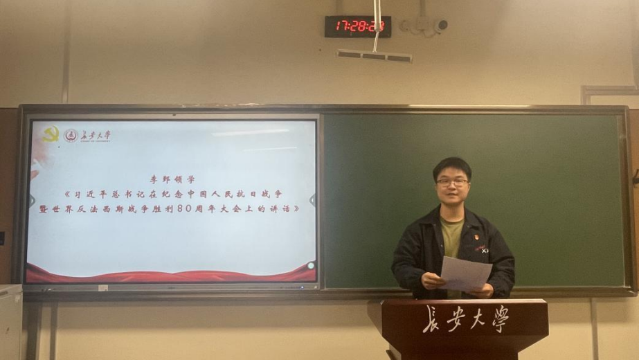 党员代表李郅领学《习近平总书记在纪念中国人民抗日战争暨世界反法西斯战争胜利80周年大会上的讲话》。习近平总书记在讲话中全面回顾了中国人民抗日战争的伟大历程,深刻阐释了抗战胜利的重大意义。李郅表示,伟大抗战精神是对这段苦难与抗争历史的精神凝练。他倡导学生党员要能深刻领会讲话精神,在今后的工作和生活中,传承和弘扬抗战精神,为国家和社会的发展贡献自己的力量。