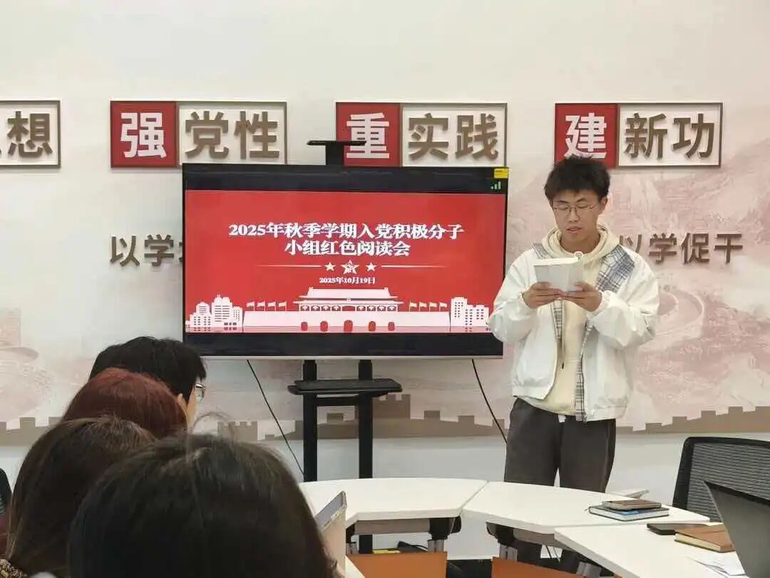 为深入学习贯彻习近平新时代中国特色社会主义思想,进一步加强入党积极分子的思想政治教育,筑牢理想信念根基,10月19日,tyc7111cc太阳成集团2025年秋季学期入党积极分子开展“学史鉴今·砺行致远”红色阅读会,小组成员全员参与,活动由组长韩泽渊主持。