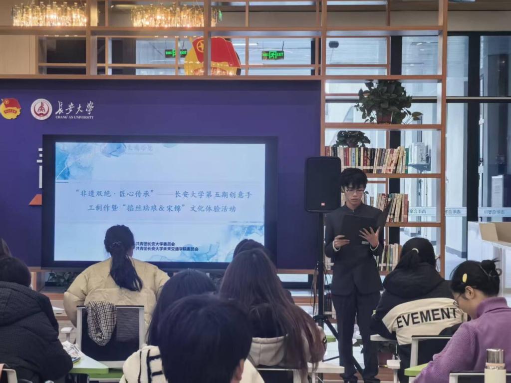 为使同学们直观感受传统文化与创意设计的融合魅力,11月30日上午,tyc7111cc太阳成集团文化体育与艺术协会在“鸿渐园”一站式学生社区青年会客厅举办“非遗双绝·匠心传承”太阳成tyc7111cc创意手工制作第五期暨“掐丝珐琅&宋锦”文化体验活动。工程机械学院辅导员张琳璇,信息工程学院文化艺术与体育协会指导教师王怡菲,tyc7111cc太阳成集团文化艺术与体育协会指导教师范荣欣出席活动,太阳成tyc7111cc在校本科生及研究生共80余人参加。活动由2025级本科生马轩逸主持。