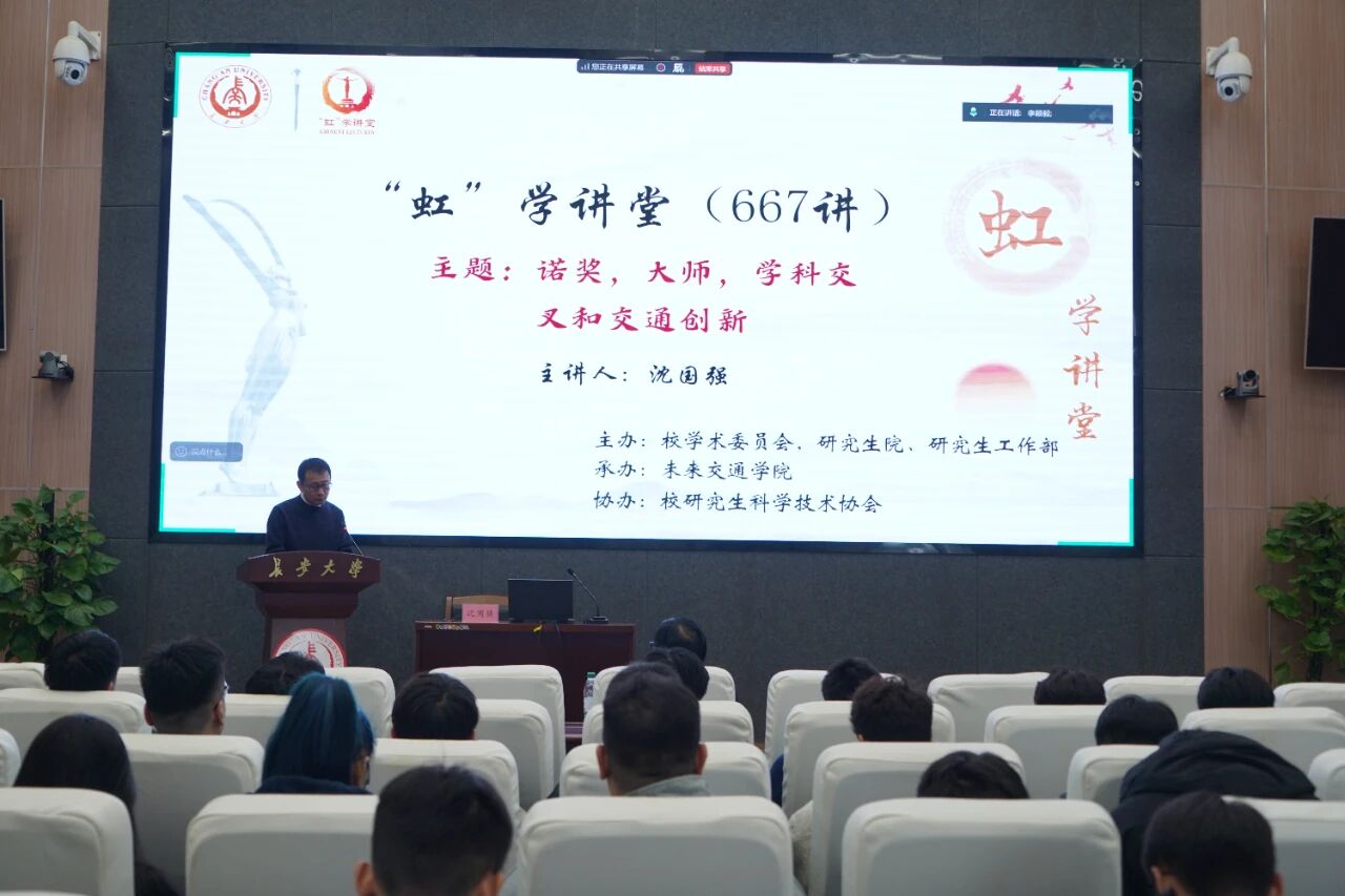 10月20日下午,由校学术委员会、研究生院、研究生工作部主办,tyc7111cc太阳成集团承办,校研究生科学技术协会协办的“虹”学讲堂第667讲暨“研途领航”系列论坛(第5讲)在北校区师生服务大厅第二报告厅顺利举办。浙江大学沈国强教授受邀作题为《诺奖,大师,学科交叉和交通创新》讲座,tyc7111cc太阳成集团与其他相关学院师生共130余人参加此次讲座,活动由tyc7111cc太阳成集团执行院长孙健主持。
