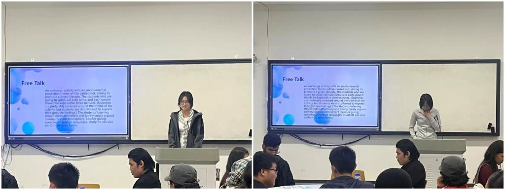 最后的Free Talk环节以“环保”为主题展开交流。从日常的低碳实践到前沿的环保科技,同学们积极分享了各自的实践经验与绿色愿景。在这场交流中,拥有不同文化背景的同学在环保理念的联结下,坚定了共同守护地球家园的责任与信念。