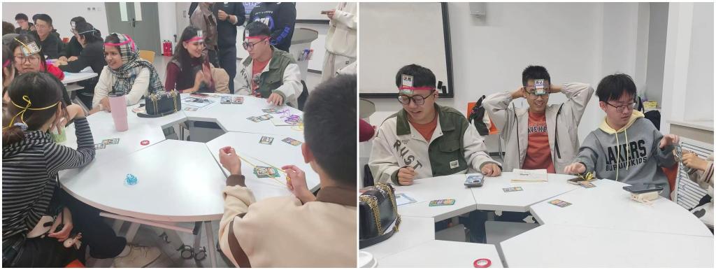 主题游戏“Don’t do That”将现场氛围推向高潮。同学们围坐在一起,佩戴带有关键词的头带,在紧张而欢乐的对话中展开头脑风暴,既要敏锐捕捉对方的“陷阱”,又要巧妙布设自己的“迷局”。言语攻防精彩纷呈,现场的掌声与欢笑不断,这场游戏既是对语言熟练度和临场反应能力的考验,更是对促进跨文化交流的生动实践。