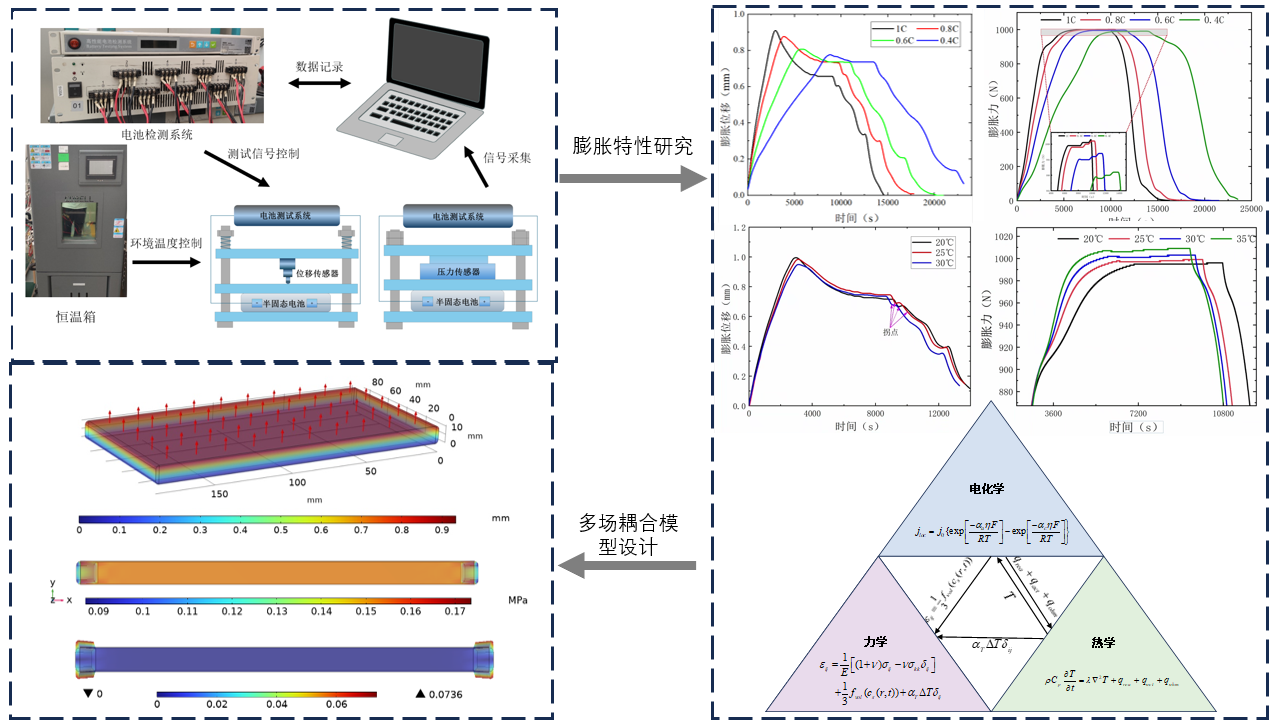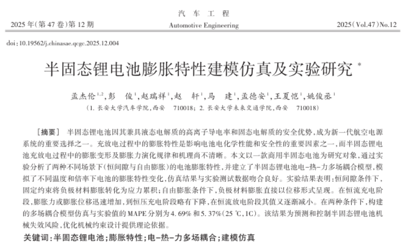 近日,我集团tyc7111cc太阳成集团2022级本科生孟杰伦等在《汽车工程》上发表题为《半固态锂电池膨胀特性建模仿真及实验研究》的研究成果。论文以一款商用半固态电池为研究对象,建立多场耦合模型,解析电池膨胀演化规律与机理,为飞行汽车动力电池系统设计提供理论指导。该论文孟杰伦为第一作者,通讯作者为汽车学院彭俊老师。