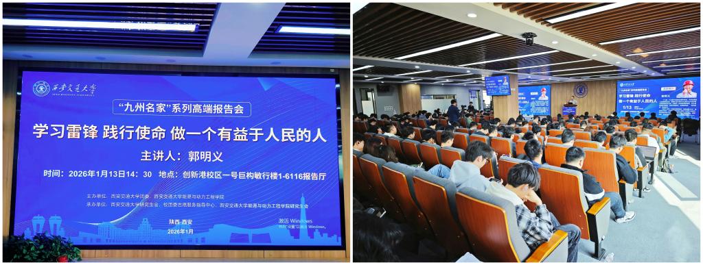 1月13日,“九州名家”系列高端报告会暨“薪火”联学西部高校代表座谈会在西安交通大学创新港校区举行,中华全国总工会副主席(兼)、全国道德模范、“当代雷锋”郭明义亲临现场,带来主旨专题报告。活动由共青团西安交通大学委员会、西安交通大学能源与动力工程学院联合主办,未来交通党支部成员刘濮瑜、王鹤松、吴琪宇受邀参会,与来自省内多所高校的学子共赴思想盛宴、共话青春担当。