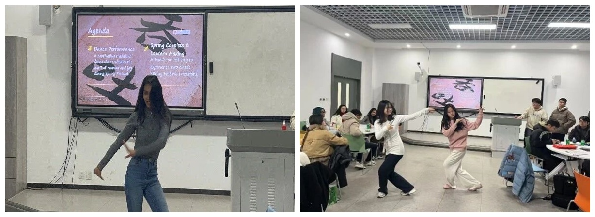 主题活动为同学们期待已久的写春联、做灯笼民俗体验环节。现场准备了红纸、毛笔、灯笼骨架、彩绳等丰富材料,志愿者详细讲解了春联的撰写技巧和灯笼的制作方法。同学们兴致盎然地动手实践,有的认真临摹春联上的英文祝福语,在笔墨挥洒间感受中西文化的碰撞;有的专注搭建灯笼骨架、装饰灯面,将对新春的美好期许融入手工创作中。活动现场欢声笑语不断,大家相互交流制作心得,在实践中加深了对春节民俗的理解。